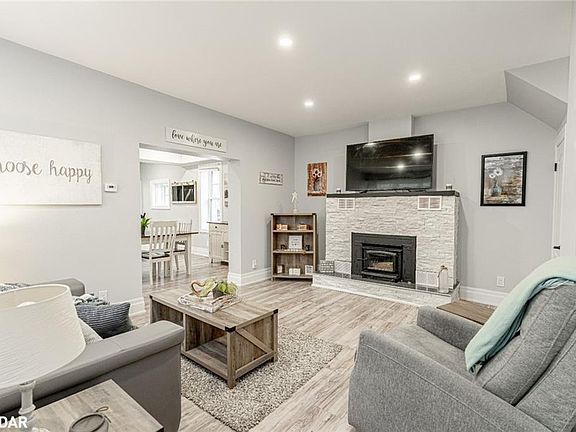 CENTURY HOME CHARM WITH A BRIGHT, MODERN TWIST IN A PRIME ORILLIA LOCATION! Situated in the vibrant heart of Orillia just a short walk to grocery stores, restaurants, schools, shopping, and everyday essentials, this fully renovated century home delivers an exciting mix of timeless charm and modern comfort. Set just minutes from the Lake Couchiching waterfront, you’ll love having Couchiching Beach Park, marinas, scenic walking trails, and the outdoor Rotary Aqua Theatre practically at your doorstep. A quick 5-minute drive places you on Highway 11 ideal for commuters. Bursting with character, the classic exterior pairs beautifully with a generous backyard offering space to garden, relax, or entertain in a peaceful outdoor setting. Inside, the open-concept living, kitchen, and dining area flows naturally and features a cozy wood-burning fireplace that adds warmth and character. The updated eat-in kitchen boasts quartz countertops, stainless steel appliances, and a 2-person breakfast bar. Offering a main floor bedroom plus two upstairs, the home’s standout primary includes dual closets and a sliding glass walkout to a private 10 ft deck overlooking the yard. The stylishly updated 4-piece bathroom showcases a relaxing soaker tub and separate glass-enclosed shower for a spa-like experience. Newer flooring throughout provides a clean, carpet-free interior that’s both modern and easy to maintain, while a skylight in the upper hallway fills the space with natural light. Complete with a spacious unfinished basement, this home offers excellent potential for storage or the opportunity to design and tailor your ideal living space. With its unbeatable location, unique charm, and thoughtful upgrades, this Orillia gem is the complete package for comfortable and inspired living!