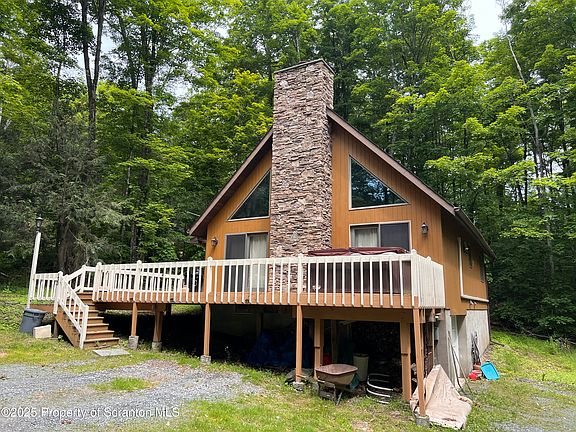 Looking for an investment property or a home for your family? 5 bedroom chalet style home on 1.07 acres minutes to Elk Mountain. Wood burning fireplace in living room with knotty pine ceiling, 2 bedrooms on main level, primary bedroom, small loft area and half bath on upper level and 2 bedrooms and 3/4 bath with laundry on lower level. Hot tub on large wrap around deck works and stays. Easy electric baseboard heat with 3 ductless mini splits for heating/cooling. 28 X 15 garage under house with small workbench. Roof is 5 years old. Excellent opportunity for rental income. All measurements are approximate and not guaranteed.