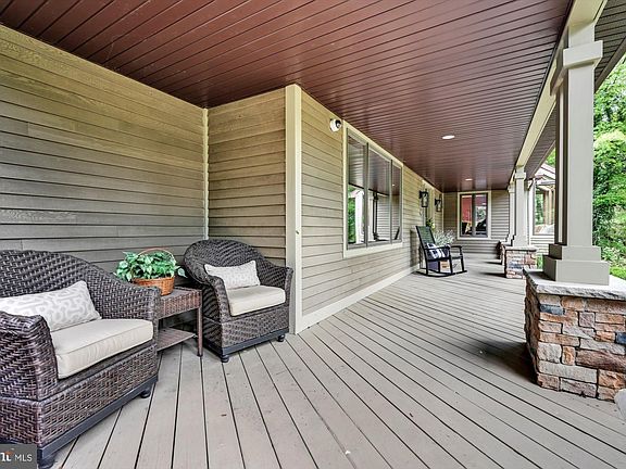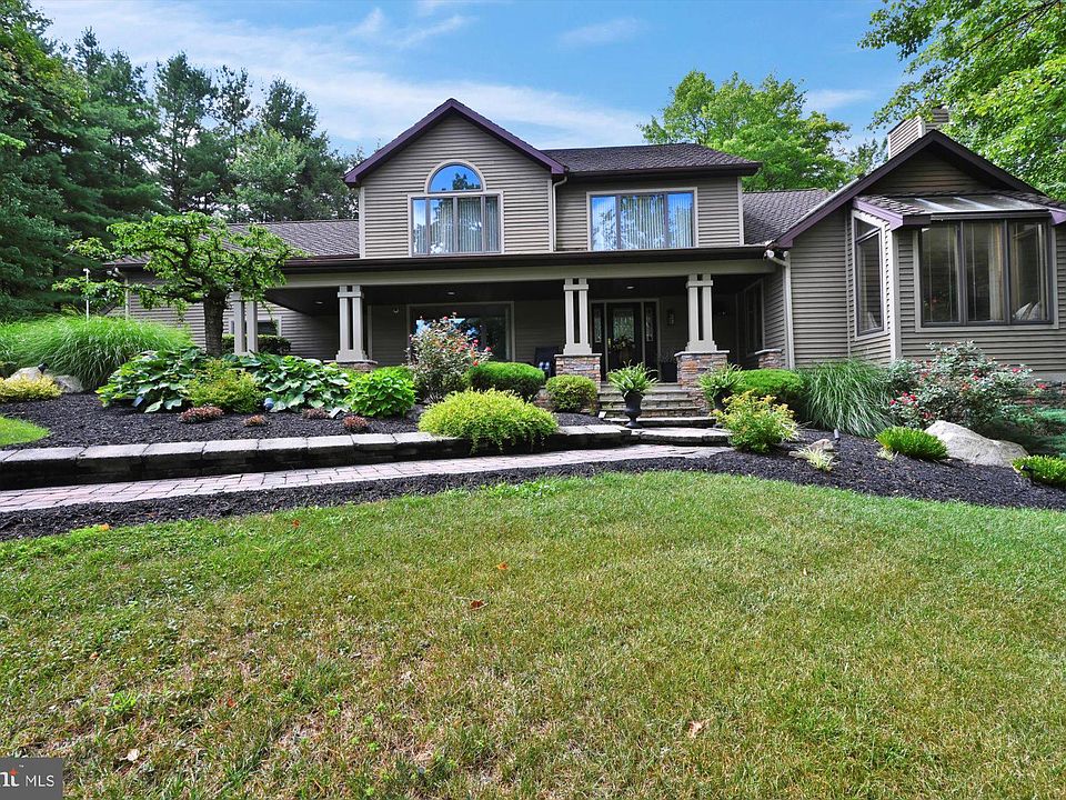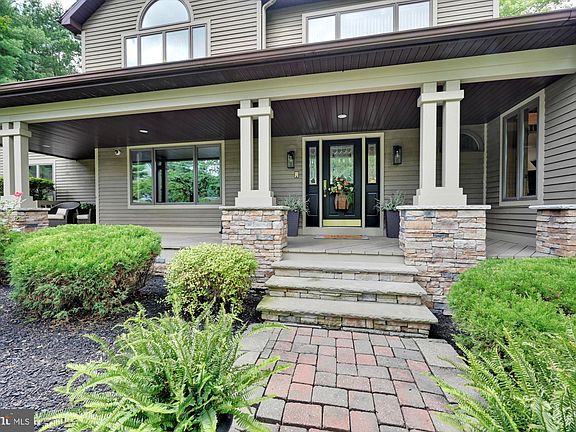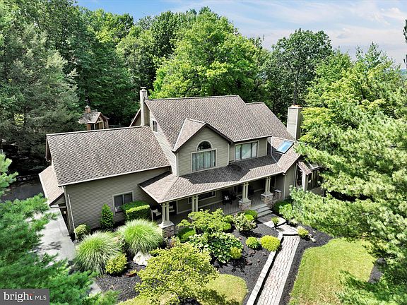 Privacy meets convenience! Maintained with excellence inside and out, this exceptional two-story architectural craftsman is situated on a beautifully landscaped 1.25-acre lot offering 180 degrees of unparalleled bucolic vistas of Sharp Mountain. Perfectly pointed brick pavers invite you to enjoy a spacious covered front porch, providing the ideal setting for morning coffee and a good book. Upon entering the home, the light-filled center foyer opens to an expansive formal dining room boasting custom chair rail and crown molding. Hand-crafted French doors lead to a Gourmet Chef’s eat-in kitchen featuring an overabundance of high-quality millwork oak cabinetry, tile backsplash, granite countertops and a spacious center island with barstool seating and views of the lush backyard. A sun-drenched first floor study is framed by a custom picture window equipped with a cozy window seat, soaring vaulted ceilings, and skylights, adding brilliant natural lighting throughout. A floor-to-ceiling corner fireplace creates ambience and serves as a partition between the study and the great room. Flowing graciously from the study and providing views to the open-concept kitchen, the great room is highlighted by floor-to-ceiling windows and glass doors-inviting in light and nature from the outdoors. A private laundry room with a full bath for eager swimmers or pool guests, and a half bath complete the first floor. The second level offers a spacious primary suite featuring a vaulted wood beam ceiling, a dual fireplace, two oversized walk-in closets, and triple glass doors leading out to a private balcony and an elegant ensuite bathroom equipped with a large whirlpool tub, dual vanities, and a walk-in shower. A secondary full bath with dual vanities and a large standing tile shower serves four additional, generously sized bedrooms - one of which would be a perfect private home office or recreation room. Access to supplementary storage on third level is tucked off the hallway. Enjoy multifunctional spaces in the fully finished walkout lower level, offering a home fitness space, large recreation room, brilliant fireplace, expansive wet bar, half bath, and ample additional storage. Outside you’ll find a sensational, partially covered wrap-around custom deck replete with a built-in bar with 360 degrees of stool seating, a cozy firepit, and a masterful 18 x 36 8ft deep inground pool - prime for entertaining and al fresco dining. A spacious pool house and storage room provide a home for pool floats and maintenance equipment, and an oversized 2-car garage with a long driveway allow for easy and transitional living. Call for your private tour.