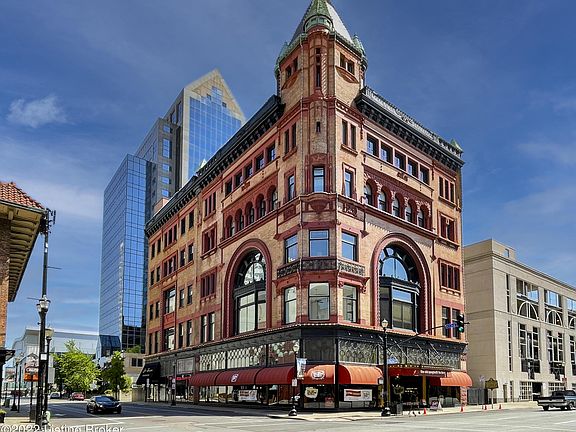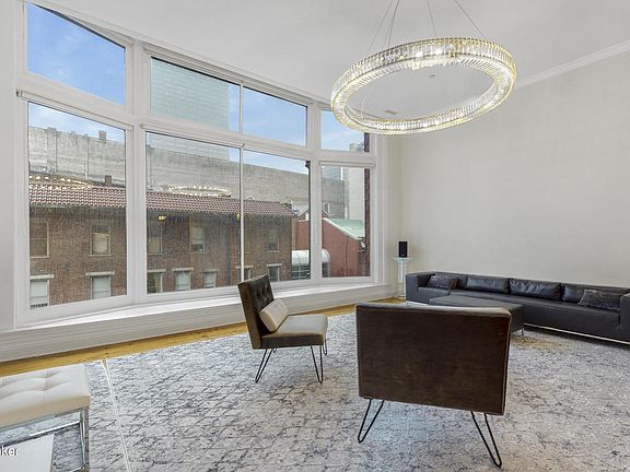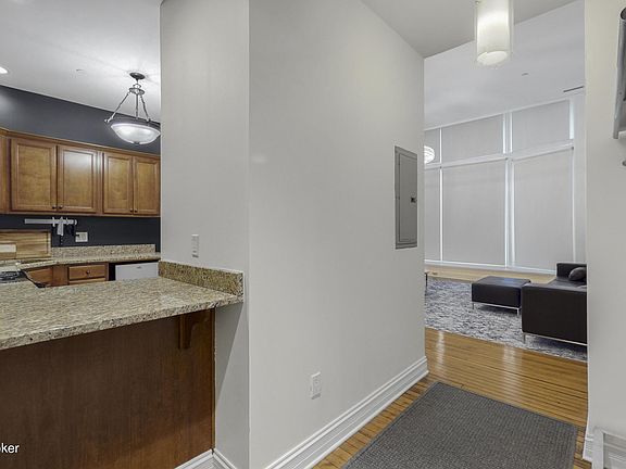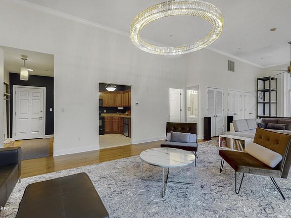 Striking Loft Condo that's truly unique from the others on the market. Step inside to modern luxury with the warmth of original hardwood floors, crisp white walls, and soaring ceilings. The wall between the bedroom and living space was removed for an unencumbered view. There is a magnificent chandelier positioned perfectly over the conversation/dining area. Two walls of windows offer spectacular city views and lots of natural light, complete with energy efficient blackout and solar shades for optimal lighting control. The full bath was renovated in 2015 to include a spacious shower, updated vanity, fixtures, and flooring. The kitchen features warm wood cabinets, granite counters, and tile floor. Located in the heart of Downtown, The Levy is a beautiful building on the National Historic Register, with easy access to local events, concerts, sports venues, Louisville's Arts Scene, museums, Whiskey Row, fabulous restaurants, and Waterfront Park. The Levy also offers elevators, a rooftop terrace, fitness room, and additional storage in the basement, plus an in-building bike rack. Owners are responsible for parking, which is available for a fee next door at the LG&E garage or across the street at Actors Theater garage. This is a premium location in an iconic building. Long term rentals are allowed, but sorry, No Airbnb. Pets allowed per restrictions. The seller has loved this space for many years but has now moved out of state.