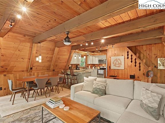 Completely remodeled, classic A-frame in Hound Ears Club. Ready to move in with renovated kitchen and bathrooms, new carpet and stone flooring throughout, and sold fully furnished. Pella windows installed in 2018, new deck and encapsulated basement in 2020. Updated ceiling fans, lighting fixtures and gas logs. Nestled on a quiet street in a gated community, this home is the perfect getaway! Hound Ears club offers separate membership that includes clubhouse access, dining, golf, tennis, pickleball, trout fishing, and pool. The community has hiking trails and a dog park. **Receiving offers until noon on Wednesday 8/22**