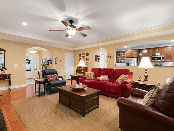 Welcome to 133 Silver Bluff, a beautifully maintained 3-bedroom, 2-bathroom ranch home nestled in the prestigious 12 Oaks community. With wainscoting, crown molding, and hardwood floors throughout the main living areas, this home exudes both charm and sophistication. Step into the spacious family room, where the cozy fireplace and gleaming hardwood floors create the perfect atmosphere for both entertaining and everyday relaxation. The open-concept kitchen is a chef's dream, featuring granite countertops, stainless steel appliances, an expansive island with seating, and plenty of prep space. The pantry is an absolute delight and spans an organized 6x10. Adjacent to the kitchen, the oversized dining area offers views of the meticulously landscaped backyard—ideal for family meals or special occasions. The master suite is a private retreat, offering serene views of the backyard. It includes a spa-like bathroom with a granite vanity, tile flooring, a glass-enclosed shower, a garden tub, and a generous walk-in closet. The second bedroom, currently used as a craft room and office, is equally spacious and includes its own walk-in closet. The third bedroom is perfect for guests or family members. Enjoy your morning coffee on the screened porch or entertain friends on the custom brick patio. The front porch is the perfect spot to relax and take in stunning North Carolina sunsets. The backyard has been thoughtfully landscaped, with plants and blooms that offer something special each season. This home is designed for easy living, with recent upgrades including a new HVAC system, hot water heater, 3 zone irrigation system and fresh exterior paint. Plus, the HOA takes care of lawn maintenance, so you can spend more time enjoying the community's incredible amenities. At 12 Oaks, you'll have access to a vibrant lifestyle with 3 pools, a clubhouse, fitness center, pickleball courts, walking trails, and a dog park. The community also boasts an active social calendar, featuring book clubs, card games, and holiday events—there's always something to look forward to! Leave the mower behind, bring the golf cart, and start your new chapter in this beautiful home and dynamic community at 133 Silver Bluff.
