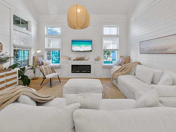 Tucked away in the heart of Phase 1 of Watercolor, this beautifully reimagined 2-bedroom, 2-bathroom cottage with an additional bunk room offers a rare opportunity to enjoy one of the community's most desirable locations. From here, you're just steps from the Watercolor Beach Club, Town Center, The Boathouse, and an easy stroll along the walking trail into Seaside. Recently renovated, the home radiates a crisp coastal feel with fresh paint, refinished floors, and stylish new furnishings inside and out. The kitchen has been thoughtfully updated with Café Series appliances, new quartz countertops and island, a new range and hood, and new shelving, all perfectly designed for both everyday living and entertaining. A cozy living room anchored by a custom fireplace and built-in cabinetry sets the tone for relaxed gatherings.
