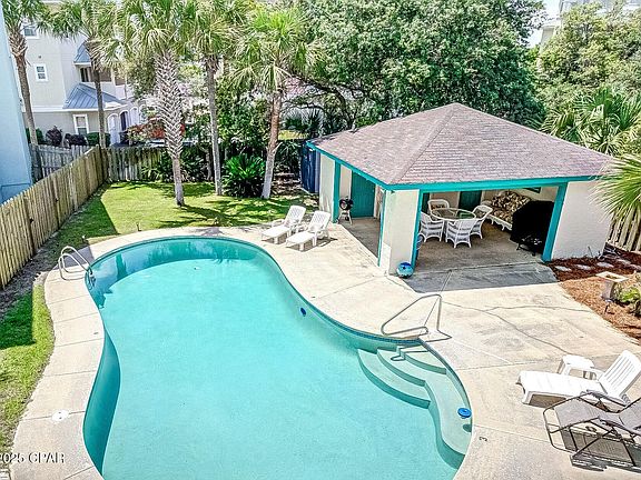 This charming cottage is the ultimate beach retreat—just a block from our beautiful white sands and tucked away to escape the crowds. Whether you're seeking your own personal getaway, an investment opportunity, or a property with short term rental ability, this one has it all. The home comes fully furnished and ready to go, featuring two spacious king bedrooms, each with its own private bathroom. One of the standout features? Your own private pool and cabana—perfect for those days when you want to cool off without getting sandy. Whether it's a quick dip after the beach or a laid-back afternoon by the water, it is an appreciated feature. A personal storage closet and shed offer additional space for beach supplies and more. Whatever tickles your fancy, this location delivers! You're just minutes from the luxury and charm of 30A—without the 30A price tag. Prefer a livelier vibe? Pier Park is only 6 miles, offering shopping, dining, and entertainment in the heart of Panama City Beach. No HOA fees and only three owners in the building. Owners share expenses for common areas, keeping things simple and cost-effective. The building has just been updated to public sewer access (no more septic!) and new electrical boxes. Turnkey ready for living or renting. Just hand over the keys and move right in! Measurements approximate, buyer to verify if important.