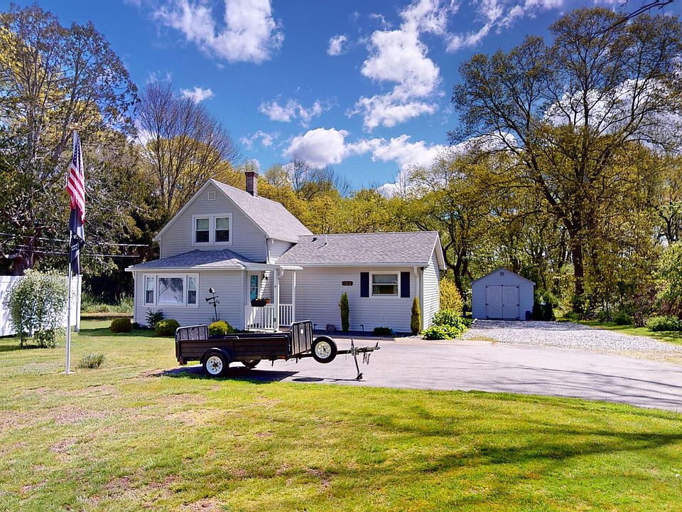 Set back off the road, 1.23 acres of plush lawn surround this cozy home with a first-floor primary bedroom suite and many upgrades. The large front and back lawns offer privacy, ample parking, and lots of opportunities for landscaping, as this homeowner has taken advantage of. Inside, a very functional and sought-after layout. Large mud room with laundry, sunny kitchen, walk-in shower in the first floor primary suite, open living/dining room, then upstairs the second bedroom offers lots of privacy and potential with it's own full bath with tub and a bonus room large enough for a gracious walk-in closet, office space, playroom, craft room, etc. The large shed/workshop has electricity, providing extra storage and workspace. *New since the current owner purchased the property: Refrigerator, Stove/Oven, Washer, Dryer, New flooring throughout entire home except kitchen and 1st floor bath, Brand new second floor bath (April 2024), 5 New Windows, Vinyl Privacy Fence, Added Recessed Lighting in Kitchen, All new ceiling fans, New Storm Doors (Front and Back), Added stone parking area, and Planted trees, shrubs, flowers.