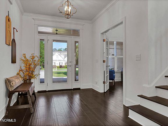 Experience the perfect blend of luxury and convenience in this beautifully designed home located in the desirable coastal community of The Harbour at Summerset. Just minutes from the Wildlife Boat Ramp and Harbour Village Marina, outdoor enthusiasts will enjoy easy access to boating and water activities. Nearby, Ironclad Golf and Beer Garden, along with Hampstead Kiwanis Park, offer vibrant social scenes and recreation. This home features an expansive open floor plan that includes a well-appointed kitchen with a large center island overlooking a cozy living room accented by a gas fireplace and built-in shelving. Hardwood flooring runs throughout the main living area and telescopic doors open to a screened porch with views of a private backyard—ideal for entertaining or quiet evenings. The main level also hosts a versatile room with French doors, perfect as a dining room or office, and three bedrooms including a luxurious primary suite with a walk-in shower and garden tub. Upstairs, find a fourth bedroom with an en suite bathroom, a bonus room, and a full bathroom. Additional comforts include a two-car garage with an EV plug and a whole-house generator for added peace of mind. The home's septic system is strategically placed in the front yard, leaving ample space in the back for potential additions like a swimming pool, should the new owners choose. For information about our preferred lender and the incentives you may qualify for, please ask your agent to review the agent comments for additional details.