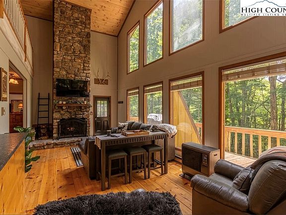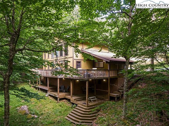 Welcome to Trails End Lodge, the perfect fully-furnished home, which includes a vacant lot next door! This turn-key ready, three-bedroom, two-bathroom home is situated right at the trailhead for Upper Pond Creek Trail, and across the street from Perry Park and the Overlook Trail trailhead. Located just one mile from Beech Mountain Ski Resort, this updated home offers year-round activities such as hiking, skiing, tubing, mountain biking, golfing, fishing, whitewater rafting, and wine tasting. This meticulously maintained property features plenty of decking, with a wraparound first level that is partially covered and a lower level complete with a new hot tub. The split-entry design welcomes you into a spacious living area highlighted by a stunning two-story rock fireplace. Large windows throughout provide beautiful views of the wooded backyard, with a valley view partially visible through trees. The beautifully redone kitchen boasts a butcher block island, stainless steel appliances, leathered granite counters, and a wine cooler. Adjacent to the kitchen is a game area equipped with a foosball table and a variety of games. The dining area includes seating for six, with additional bar seating for five at the island and bar-style table beside the sofa. The main level includes a queen bedroom and a full bathroom with a shower located in the hallway. Upstairs, you'll find a loft with a desk and chair, two bedrooms, and a shared spacious bathroom featuring a double granite vanity and a tub/shower combo. The outdoor deck features a covered dining area with rocking chairs overlooking the creek. At the front of the home, enjoy an evening around the fire pit. The lower deck offers additional seating where you can unwind or soak in the new hot tub. This home has been thoughtfully updated and is move-in ready, offering a seamless transition for its new owner. Don't miss this opportunity to own a fully furnished, turn-key ready home with an additional vacant lot next door!