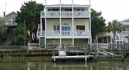 This home was completely rebuilt from the pilings up in 1998. Beautiful inverted floor plan canal home has lots of space and character. First level has spacious living area with 12 foot ceilings, 3BR, 2 large baths, front and rear covered porches, large deck and washer/dryer. Second level has Master Suite, separate Den (with Futon that can be used as 5th bedroom) and large open kitchen and living area. Fully equipped kitchen with eat-in counter and large dining room with table seating for 10+. 32 foot top floor deck affords panoramic views of ocean, marsh and Intracoastal waterway. Enjoy the ocean breeze and watch the wild deer come out at sunset for a drink from the marsh. Take advantage of the large deck on canal with floating dock to anchor your boat after a bountiful day on the water; Closest beach access is short walk about 380 yards.