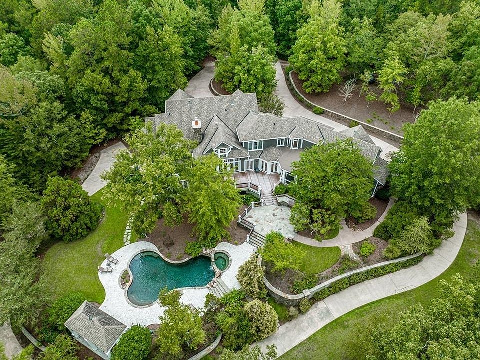"New England in the South" home was custom designed by Spitzmiller & Norris, Atlanta and sits on a beautiful 20.13 wooded acres. Driving in the 1/4 mile of concrete driveway, you arrive at what feels to be a private mountain oasis. This custom 7068 square foot home offers 5 bedrooms and 6 1/2 baths on three levels. The beautiful hardwood floors have a custom inlay in the foyer. The dining room has a custom built in cabinet. The living room has tons of natural light, great floor space for large furniture, stone fireplace, custom built in cabinets, with a beautiful wood mantle. Wine bar has easy access to the kitchen, living room, and back porch. The custom kitchen has great cabinet space, built-in refrigerator, gas cooktop, island work space with seating, breakfast area, and walk in the pantry. Work from home in the main level office with built in bookshelves and the nature views. The spacious master bedroom has great natural light with seasonal views, two large walk in closets, and a custom bath with all the amenities. The beautiful stairway leads to three large bedrooms upstairs with each having its own bathroom. The large bonus room is great for playroom or bedroom. The basement offers a very unique custom soundproof room powered by its own 20 amp service. Also has additional living room space, workout room, and a full bath for pool guest. Entertain many friends in the backyard oasis with custom landscaping that surrounds the home and pool area. The in ground salt water pool is surrounded by an elevated stone hot tub with a waterfall. Food and drinks under the pavilion.