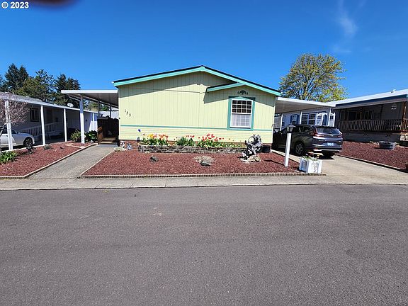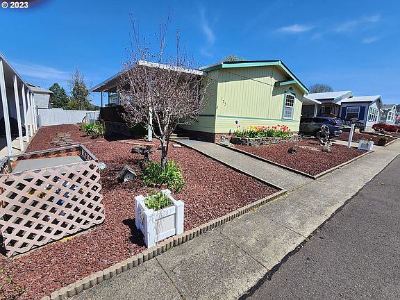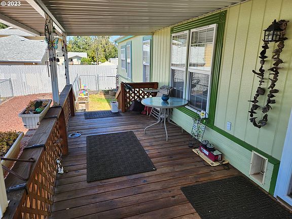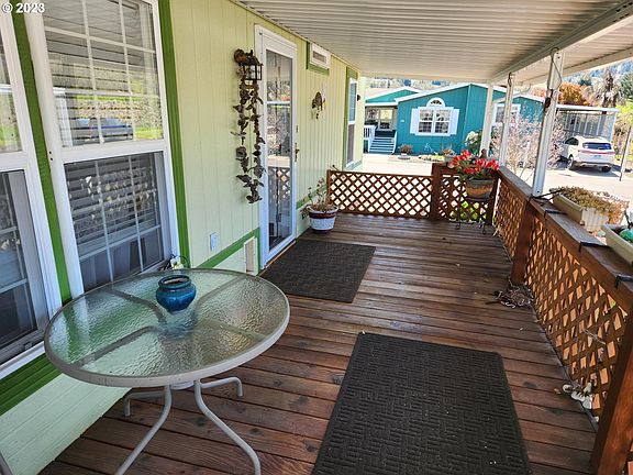 Nice well taken care of 3 BR, 2BA home plus office, is located in a great 55+ park in Roseburg. Open floor plan with large living area. Dining room, plus breakfast nook in kitchen with bay window. Lg. Primary bedroom and handicap assessable bathroom. Lots of storage throughout home. Relax on the deck and enjoy the view. Has a small, fenced yard off deck great for small pet. Newer roof, easy care yard. Wheelchair ramp on carport side. Storage & garden shed. Rent includes, sewer, water and trash. End of road privacy with nice views. Buyer to verify rent amount and discount for early payment.