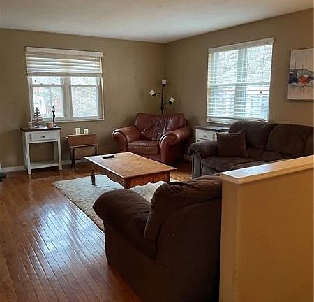 This is a really neat property with a great yard - there are two garages each with individual openers and newer doors - the larger bedroom has brand new carpet, entry door, and closet doors - the smaller bedroom has glass sliding closet doors along with a desk area - both bedrooms have overhead lighting - the equipped kitchen has exposed hardwood floors and eating space at one end which overlooks the large living room also featuring exposed hardwood floors -
