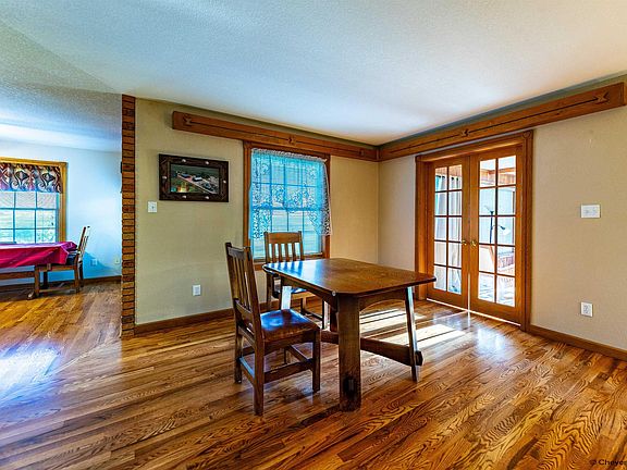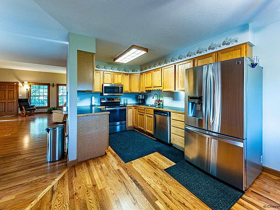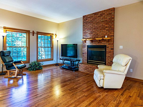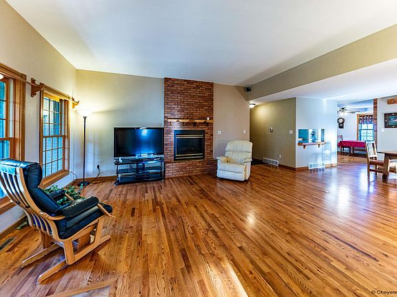 Perfect for 4-H projects, hobby enthusiasts, or those needing ample space to store tools or toys, this property offers stunning and peaceful scenery with breathtaking views of the Laramie Range. Situated just south of Wheatland, this close-in rural property provides the perfect blend of country living with convenient access to town. The property boasts an abundance of mature trees and a delightful garden spot, creating a serene and picturesque environment. Enjoy the incredible mountain views while relaxing on the patio or exploring the expansive grounds. The significant outbuildings include a 50x70x16 commercial-grade metal shop with a 6" concrete floor, three 14-foot overhead doors, and a rough-in for a bathroom. Additionally, the 2400 SF metal building features a heated workshop with 220v service and a half bathroom. Ideal for horse enthusiasts or 4-H projects, the property also includes a 1,152 SF barn, pipe corrals, hydrants, and a fenced pasture. It comes with full irrigation rights from Wheatland Irrigation District and has no covenants, ensuring complete freedom to enjoy the land as you wish. The brick home itself features oak hardwood floors in the living room, dining room, and kitchen. The living room has a charming brick gas log fireplace, while the kitchen is equipped with oak cupboards, stainless steel appliances, and a cozy breakfast nook. This ranch-style residence offers a split floor plan. The sunken office, accessible through sliding glass doors, opens to the patio. The basement includes a wet bar, perfect for entertaining guests, as well as a sewing or craft room. Other amenities include Anderson windows, underground sprinklers, egress windows in the basement, central air conditioning, and a new leach field. The finished and insulated 2-car attached garage provides convenience and comfort.