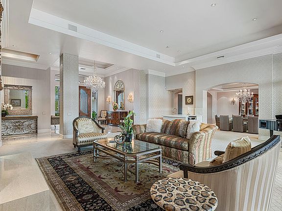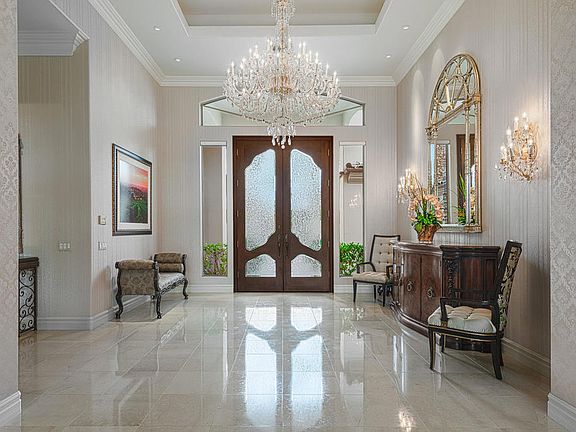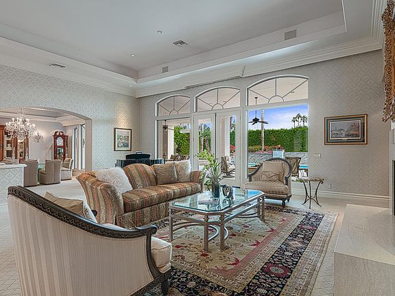 Grand and elegant showplace in opulent, gated Waterford offers total luxury in the heart of Rancho Mirage. Imposing street presence with circular driveway, manicured lawn and massive double doors designed to impress. This executive mini-estate has all you need for desert resort living: oversized rooms, soaring ceilings, breathtaking vistas from tall French doors throughout and a Ritz-Carlton backyard with saltwater pool, spa, fountains and firepit. Space heaters and misters for year-round pleasure. Add practicality to the luxury and you'll appreciate the owned solar panels, updated systems and appliances. Truly a one-of-a-kind home in a private, rarely-available neighborhood equidistant to the delights of both Palm Springs and Palm Desert. An uncommon opportunity.