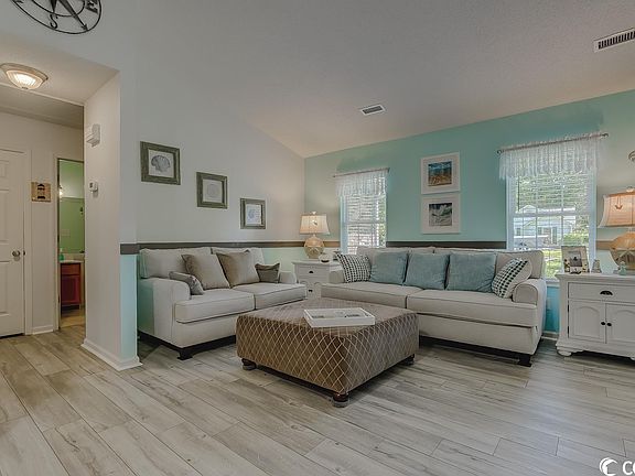 It’s A Beauty in the popular 55+ community of Woodlake Village. Pristine 2 bedroom, 2 bath home with 1 car garage and open floor plan. As you drive up to this home, pride of ownership is immediately apparent. Well-maintained front yard with palm tree, house with brick veneer with aqua shutters and decorative front door. Enter the recently painted home into a spacious and open living room with vaulted ceiling, newer laminate floors, chair rail, and dining area with skylight. The chef in the family will enjoy the remodeled gourmet kitchen with granite countertops, wainscoting, breakfast bar, stainless steel appliances, custom cabinets, tile floor and window open to the Carolina Room. The dining area adjacent to the kitchen, currently used as a sitting area, flows into the spacious family or Carolina Room. Laundry area with cabinets and washer and dryer. This home features 2 master bedrooms. One master bedroom features a walk-in closet and a built-in vanity area and master bath with window and shower/tub. The 2nd bedroom has a good-sized closet and 2 large windows overlooking the nicely landscaped front yard. Guest bath with tile and walk-in shower. Many hours are sure to be spent relaxing in the spacious Carolina Room, with windows all around, newer mini-split, ceiling fan and views of the private backyard. This will be a great place to start your day enjoying your favorite morning beverage and nature at its best. Or better yet, head through the newer slider to the large backyard patio. What a great spot for grilling, entertaining and building memories with family and friends or just relaxing and enjoying the sights and sounds of nature. This is sure to be one of your favorite places to relax, read a good book or enjoy the outstanding views of the wooded yard with brightly colored azaleas and camelias depending on the season. Entertaining comes naturally here – it is truly your own private oasis. Oversized 1 car garage with shelving and floored storage in attic, irrigation system. New roof (August 2022), newer Mini Split in Carolina Room (2020) and irrigation pump (2018) Close to beach, restaurants, golf courses, shopping, hospital, Murrells Inlet Marsh Walk. Low HOA fees, great amenities including a community clubhouse with pool, library, pickle ball and shuffleboard courts. Truly a must see! Make an appointment. You will not be disappointed! Measurements and square footage are approximate and not guaranteed. The buyer is responsible for verification.