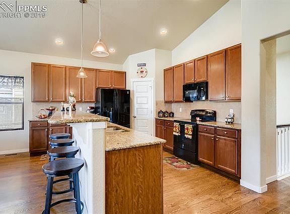 Beautiful home ready for you to move in with all the extras! This home is fully landscaped with a working fountain/pond in the backyard. Huge oversized wood deck, fully fenced and majestic views of Cheyenne Mountain. Home boasts and open concept with a large kitchen with granite countertops all appliances and a kitchen bar. Hardwood floors are gorgeous throughout the main level. Walk out from the separate dining room unto the back deck and take in the views! Main level has a bedroom and full bathroom as well as a large master retreat with a 5 piece en-suite bathroom and large walk in closet. Downstairs overs another full bathroom as well as three large bedrooms and a HUGE family room / recreation room. Pool table and game table that fit perfectly can be purchased. Lots of storage in this home. The property is not missing a single detail to include A/C. Large garage with lots of room. This home is close to I-25, shopping and military bases. It is beautiful and will go fast be sure to check it out and bring us your offers!