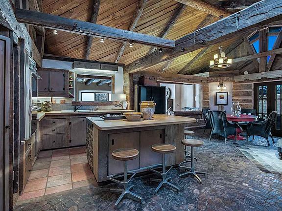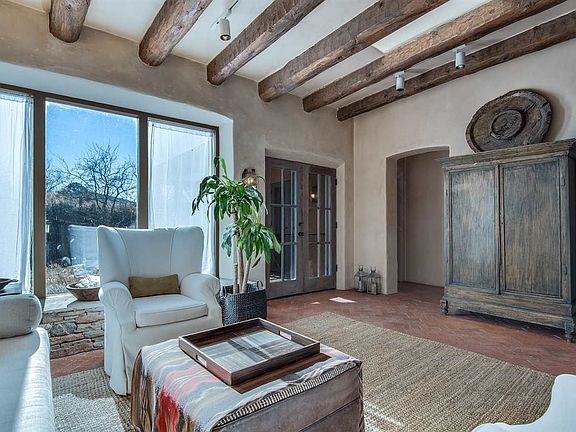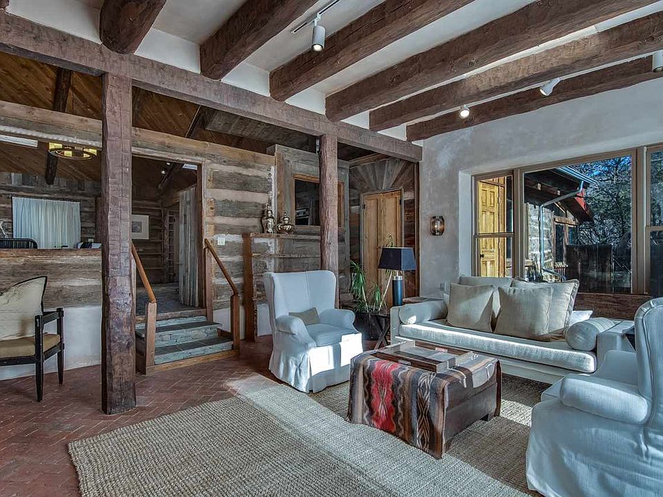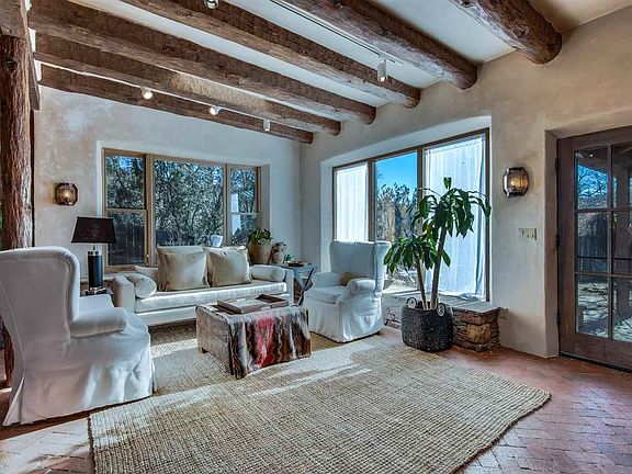 This remarkable and unique property sits on an exquisite 2/3 of an acre just off of Upper Cerro Gordo with beautiful canyon and watershed views. Artfully conceived as a partial log home and modern Betty Stewart designed addition~ the 3 bedroom, 2 bath plan features soaring rafters and hand-wrought Raton beams, hand-laid brick and patterned stone floors, coved ceilings, open concept kitchen to dining, separate master suite, multiple walk outs, east facing sunroom, ample carport and a wonderfully lush setting replete with fabulous firepit 'arena'. This beautiful blend of romance, form and function offers the very best of Santa Fe~privacy and views minutes to the Plaza, Canyon Road and the Railyard.