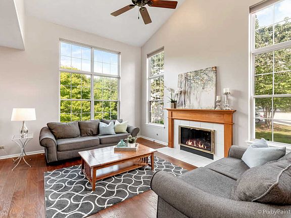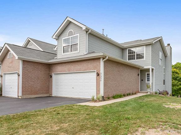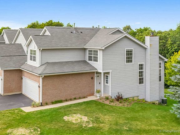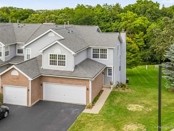 Move-in ready END UNIT with PRIVATE ENTRANCE and a WALK-OUT BASEMENT, deck and patio overlooking private WOODED AREA. FRESHLY PAINTED. Gleaming dark rich WOOD laminate flooring. Newer carpeting. FIRST FLOOR LAUNDRY. OPEN CONCEPT floor plan. LIGHT AND BRIGHT. 2 story living room with FIREPLACE. Spacious LOFT can be used as OFFICE, den, or convert to a 3rd bedroom. Master bedroom features a large private bath with double sinks plus separate makeup vanity area, water closet, and spacious walk in closet. Both bedrooms are spacious in size. Kitchen offers an eating area, STAINLESS STEEL appliances, and lots of cabinets and counter space. Dining room area slider leads to DECK overlooking wooded backyard. Bright walk-out basement is ready for your finishing touches with lots of storage and leads to private patio with serene backyard wooded views. Spacious 2 CAR attached garage and LONG driveway. Convenient guest parking areas located directly across from unit. AMAZING LOCATION! close to schools, neighborhood PARK, conservation areas, shopping, dining, TRAIN, I-90. Don't miss this one! QUICK CLOSE POSSIBLE!