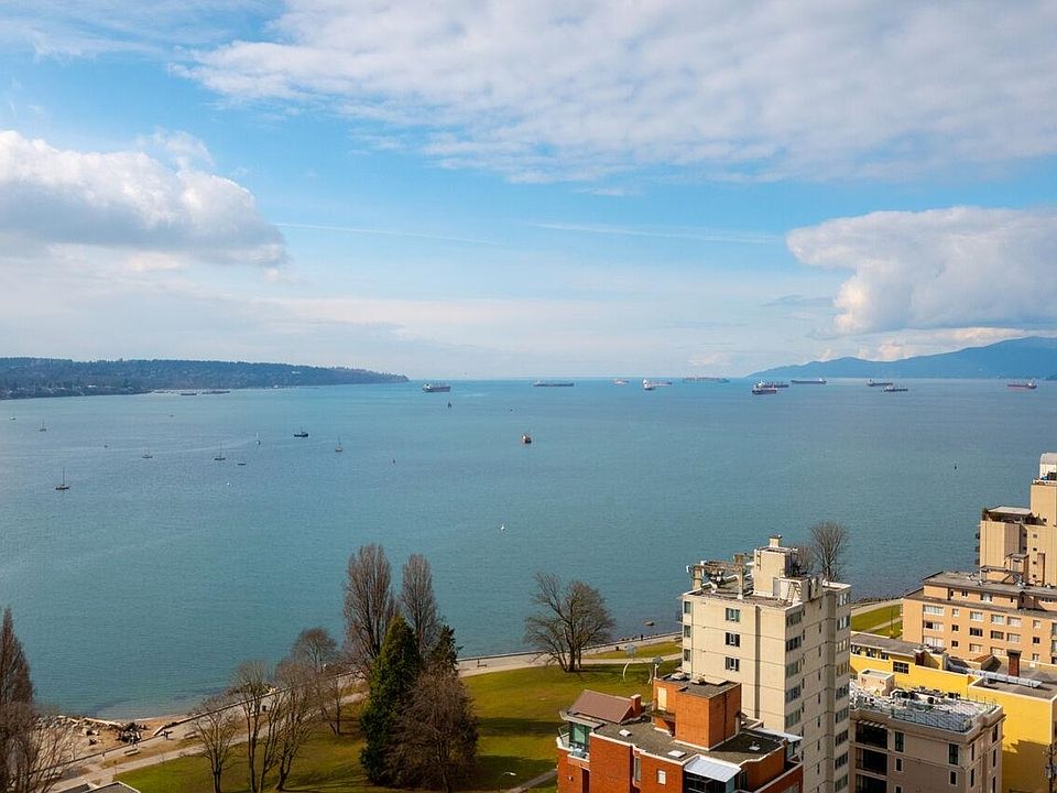STUNNING VIEWS FROM BRIGHT, AIRY NW CORNER STEPS TO SUNSET BEACH & ENGLISH BAY. ENJOY OCEAN, SUNSET, CITY & MOUNTAIN VISTAS FRONT ROW SEAT TO CHANGING WEATHER PATTERNS, SAILBOAT REGATTAS, FREIGHTERS & OCCASIONAL CRUISE SHIP! LARGE SQUARE ROOMS ACCOMODATE HOUSE SIZE FURNISHINGS: DINING FOR SIX, COMFORTABLE LIVING AREA & BALCONY FOR ENTERTAINING AS WELL AS KING SIZE BEDROOM & CHOICE OF WORK AT HOME AREA. SMART NO WASTE SPACE FLOORPLAN UPDATED OVER THE YEARS WITH ALL ORIGINAL FIXTURES UPGRADED OR REPLACED & KITCHEN AREA OPENED FOR MODERN DAY USE. EXTERIOR & COMMON AREAS UPGRADED IN RECENT YEARS OVER A $7 MILLION PROJECT. UNDER GROUND PARKING & LOCKER INCLUDED WITH PURCHASE OUTDOOR POOL & GARDEN. STROLL/ CYCLE TO SHOPS, RESTAURANTS, GRANVILLE ISLAND FERRY & STANLEY PARK!
