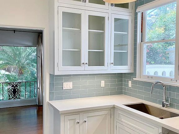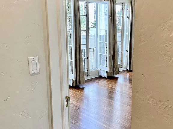 This wonderful front apartment, in the grand and glamorous El Pasadero, is more like a home than an apartment. With a graceful layout, it has big rooms, high ceilings, tall French windows and remarkable historic features which are beautifully restored. The living room is large, with beautiful bottle glass windows, a faux fireplace and gleaming original wood floors. The dining rooms windows look out over the lovely trees of Harper avenue. The master bedroom overlooks the charming historic courtyard on the north and the second bedroom (which would also make a perfect office) has it's French windows on the wonderful gated courtyard. It comes with one parking space in the garage below. Unfortunately, this is a no pets building.