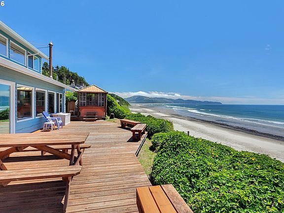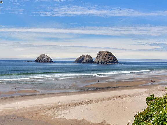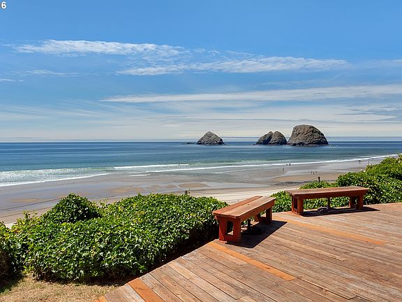 OCEANFRONT BEAUTY "Anemone House" features accessible ground floor living with 2 bdrms on main and 3 additional bdrms upstairs. Striking interiors include beautiful white marbled granite slab counter in kitchen with real mother of pearl backsplash, solid maple custom cabinets, solid knotty alder doors. Massive oceanfront deck. Panoramic view incl 3Arch Rocks & Cape Lookout. Stellar success as vacation rental. Steps to coffee & cafes.