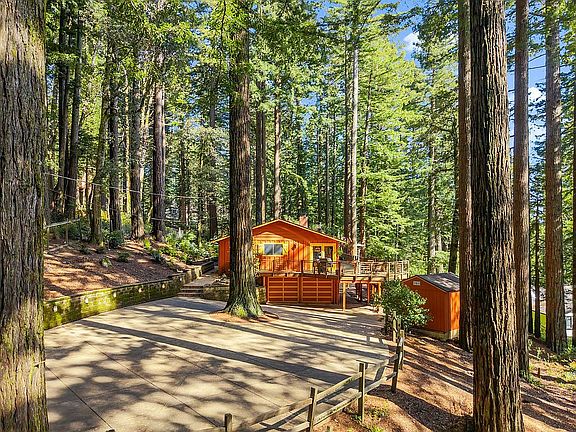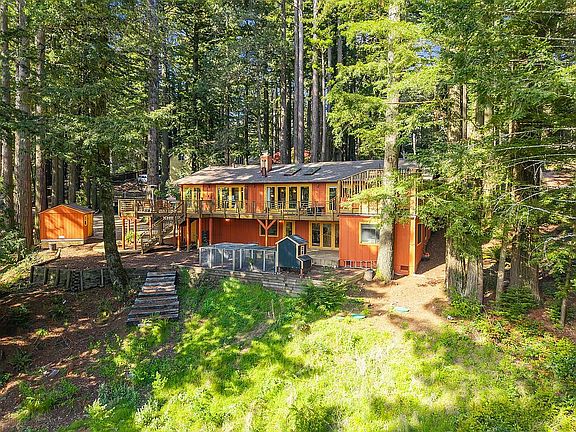 This is a warm home in a beautiful mountain setting. The exposed ceiling beams add a lot of character. The large rock fireplace in the dining room is inviting and the upstairs bathroom floors are comforting from the radiant heat. Nestled in the Redwoods off hwy 35, this home offers a Tahoe-like retreat with relaxing amenities. The solid redwood deck is lined with French doors for easy access to multiple rooms and is great for entertaining. At the end of a busy day, gaze at the stars peeking thru the redwoods while soaking in the deck's hot tub. Situated halfway between SF and SJ, it is ideal for the Bay Area commuter. Neighborhood trails for hiking & biking. Short scenic drive to Half Moon Bay & ocean beaches. Distinguished Kings Mountain Elementary is nearby. A bonus is the lower level bedroom quarters, has a living area, partial kitchen, bathroom & separate entrance!