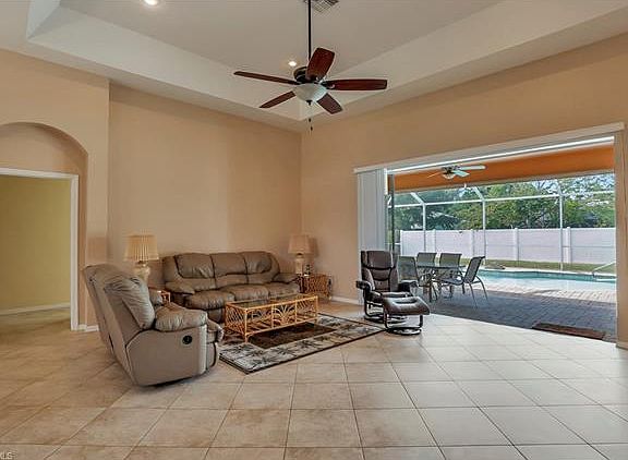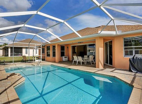 Welcome to your new home***3 BED + DEN...city utilities PAID***Located in a great neighborhood intersected with an extensive canal system which eliminates drive through traffic but remains close to all the amenities you desire. Enter this awesome home through the 8' double door entry with transom window above with a direct view to the lanai & pool. Large great room offering 13' high trey ceilings and 8' tall pocketed slider doors leading out to the screened in lanai. Volume ceilings throughout with 18" neutral premium tile set on diagonal. Kitchen features granite countertops with raised panel cabinets and stainless under mount sink, smooth top range, side-side refrigerator with water and ice dispenser. Sun filled dining area with 4 windows. Large laundry room with tub and wall-to-wall closet for added storage. The owner's suite has a large walk-in closet, corner soaking tub, separate shower, dual vanity and a water closet. Custom built pool (2012) w/ brick coping & paver decking, sun shelf, electric heat pump, efficient variable speed pump, self filling and sanitized via salt generator. This home is in excellent condition and ready for a new owner. ***NO FLOOD INSURANCE REQUIRED***
