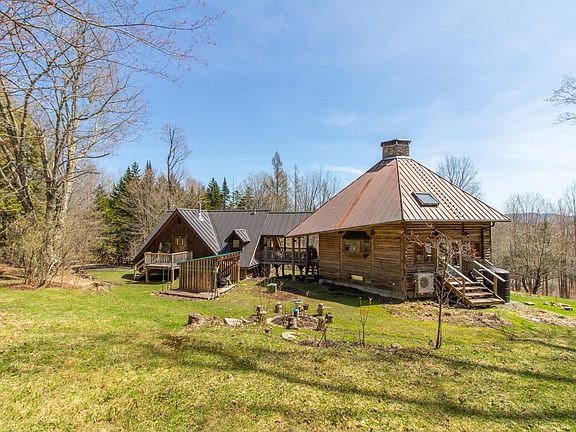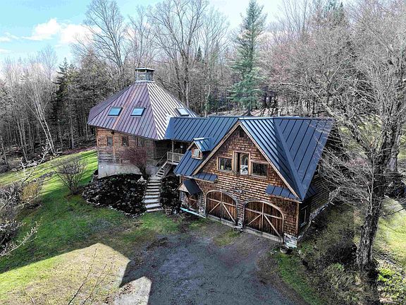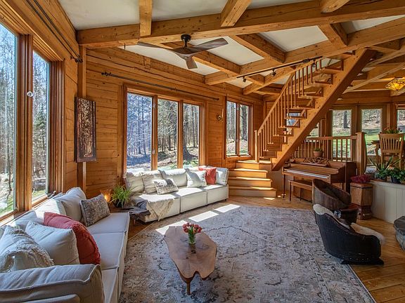 Nestled among the trees on 8 acres, this enchanting home is like no other. Once you hear the birds sing, see the flowerbeds bursting with brilliant color, and feel the warmth of the sun filtering through the leaves, you’ll feel as if you’ve stepped into a fairy tale. However, this custom-built 6-sided home is very real, unique, and special. The hub of the home is a central stone column with a built-in fireplace in the sunken living room and a wood-fired BBQ in the kitchen. Softwood floors, an intricate design of exposed beams, and an abundance of windows make the open plan first floor an inviting, light-filled space. Also on this level is a laundry room and ¾ bath with a tile and glass shower. Three bedrooms encompass the top floor, with the main bedroom enjoying views of Craftsbury Common. In the upstairs bath, a jetted tub/shower is warmed by an open fireplace. The walk-out basement offers plenty of storage. The covered porch is an ideal spot to sip your morning tea or coffee or fill up the clawfoot tub for a refreshing dip. The porch also leads to a wide open and well-lit space that would be perfect as an artist studio, yoga space, or whatever suits your needs, complete with ¾ bath and small kitchen. Below this space is a 2-car garage. The land is mostly wooded with some lawn area and perennial beds, plus there’s a sweet little pond. If you’re bored by cookie cutter houses, come to the quaint town of Craftsbury where you’ll find a home that speaks to your soul.