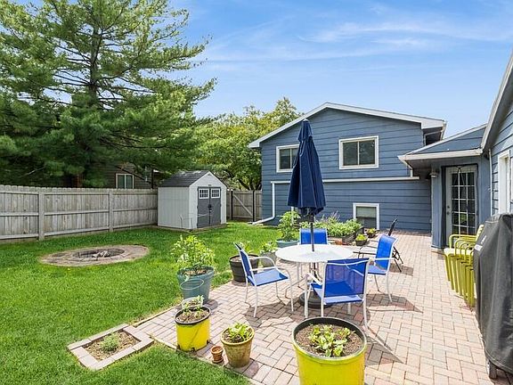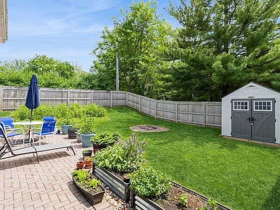 Backyard built for entertaining — fully fenced with a large brick patio, firepit, planter boxes, gardening spaces, and a brand-new shed