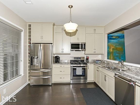 Stunning 3B/2.5 BA Milton townhome in superior school district within walking distance of Avalon, Milton shopping district and Windward technology center. Original owner. Dramatic two-story step-less entry and great room. Separate open concept family room with direct vent fireplace. Formal dining room with judges paneling and eat-in kitchen with pantry and sliding glass door. Huge vaulted master suite with walk-in closet, separate shower and soaking tub, dual vanities and separate water closet. Two additional bedrooms with bath. Additional attic storage. Private wooded back yard. Extra large patio with security spotlights. Garage plus parking for three additional cars. Freshly painted inside and out. New flooring throughout. New stainless steel appliances. New granite. This one will not last long!