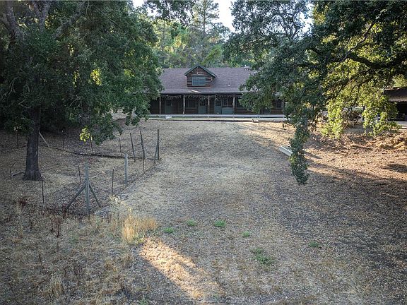 You'll feel right at home in this 4 bedroom 3 3/4 bath log cabin sitting on 2.95 picturesque acres with views in every direction! The rustic kitchen boasts granite counter tops and newer appliances including a 6 burner Thermador range with unique backsplash. Upstairs is a large family room that could function as a game room or additional office space. The downstairs living room boasts a beautiful river rock fireplace which makes for cozy, warm winters. The primary suite has a wood burning stove and opens to a large patio where you'll enjoy a tranquil setting amongst the beautiful oak trees. There is a detached workshop for plenty of additional storage. With a little love, this property could be your dream come true!