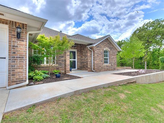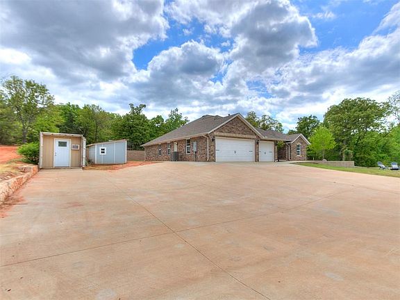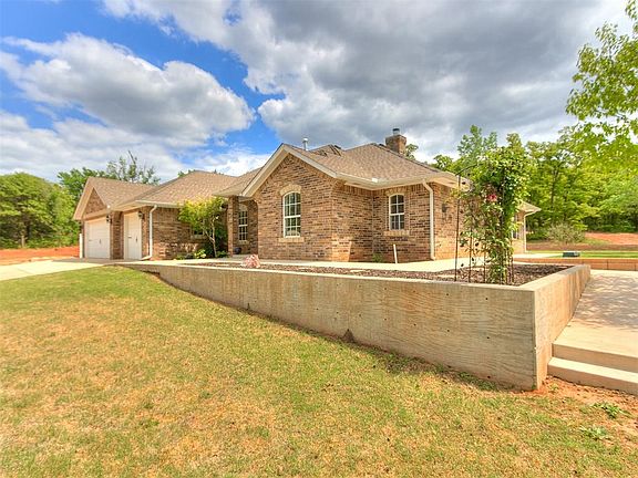 Secluded and very private four bed, three bath home that sits tucked away on 8.79 acres that is heavily wooded. Enjoy the peaceful quiet of country living. Many improvements have been made to the land. Some trees have been removed and retaining walls added around the property for a garden, French drains & sodded yard near the home. Concrete walkways have been added to safely tend to the garden. Watering spigots added in various spots near the home. Shop w/ concrete floor added along w/ a storage container that could used as an office. Shop could house work equipment. There is also a three car garage. Conduit has been added to various spots around the property for the new owner to add as needed. There is an extra outbuilding for storing lawn equipment and a new chicken coup. Lots on concrete added to the drive and for additional parking and flooring for the shop. Open concept kitchen with lots of bar stool seating around the large, granite island w/cooktop, island storage beneath, tons of cabinet space and counter space. Large pantry w/stainless appliances. The home has bamboo, wood floors and tile throughout. This home is fully electric w/a wood burning fireplace. There is a flue through the living room ceiling/roof to add a wood burning stove. Large bedrooms throughout the home w/spacious closets. Front bedroom could be an office. Formal dining room w/ large windows for plenty of natural light for hosting guests. Canned lighting throughout the living room and kitchen. The home has blinds throughout w/ the exception of the front windows. Owner's suite is large and very private from secondary bedrooms w/ wood floors. Owner's bathroom has wood type tile, double sinks and , toilet is in separate closet for privacy. Jetted tub and tiled shower. Large closet w/ tiled floors. Large covered back patio. Close to the Turner Turnpike, I-35 will take you to downtown OKC or Edmond and very close to the new Kickapoo Turnpike.