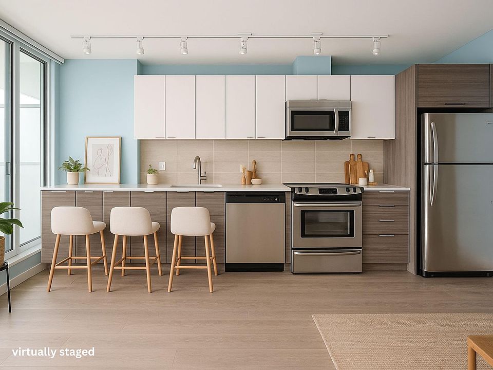 South-facing homeAmple cabinetrySunny south-facing balcony