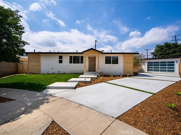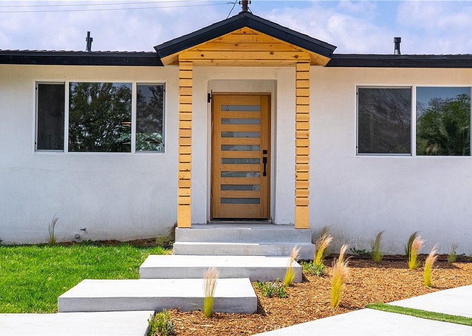 Welcome to this stunning renovated home, located within a charming community in the city of Arleta. Upon arriving to the property you'll notice the mid century modern architecture of the home. As you enter the space you’ll be greeted with an open floor plan, natural light and white oak vinyl floors. The stunning kitchen features white carrera backsplash, a large waterfall island with seating space, black quartz countertops, and beautiful wood paneling details. Next to the kitchen you'll have a spacious dining area perfect for multiple guest. The living room is truly an entertainers delight, it features beautiful black textured tile that wraps around the fireplace, oak shelves, cabinetry, large windows and a sliding door that leads to an ultra private backyard. The ensuite master bedroom features large white carrera tiles, black porcelain floors, quartz countertops, beautiful oak vanity and standup shower. The home also features two additional bedrooms, guest bathroom and a spacious laundry room. Other remarkable features to note are new roof, new windows, all new stainless steel appliances and sprinklers with drip system. The detached garage has also been completely revamped and can be converted into a separate office space, gym or studio. This home is truly remarkable and every detail has been well thought out, conveniently located near 5 and 170 freeway and also Panorama mall.
