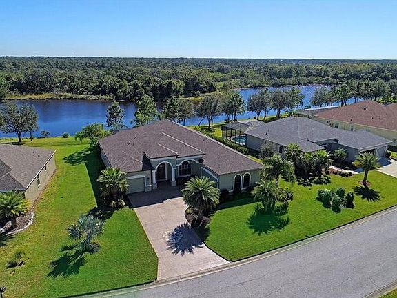Welcome to River Plantation and this Exquisite custom built water front home providing tranquility with amazing water and preserve views that are Rarely Available! Entering the double front doors and the grand foyer, you immediately see the beautiful custom design of this spacious home and the professional designer upgrades. This one of a kind home has 3 bedrooms, 3 bathrooms, and an amazing great room with pool and water views. The gourmet kitchen features granite counter tops, solid wood cabinetry, custom tile back splash, two large pantries and a breakfast bar. Additionally the den adds space for a home office or crafts room. The master suite provides views of the beautiful water way and the preserve, has two large walk-in-closets, master bath with dual sinks, walk-in shower, and garden tub. Additional upgrades include plank tile floors, tray ceilings, crown molding, architectural detail throughout and so much more. Exterior features include lush landscaping, split 3 car garage for additional storage and an irrigation system. River Plantation features a community pool, playground area, and is just a short drive to St.Pete, Tampa and Sarasota. Launch your own kayak from the back yard, the water way provides direct access to the Manatee River. Conveniently located near schools, shopping, and restaurants. Easy access to the new Fort Hammer Bridge connecting you to Lakewood Ranch in just a matter of minutes. Come experience this beautiful home for yourself and everything it has to offer.