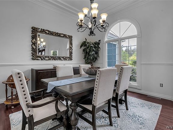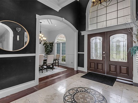 Breathtaking custom-built ranch set on a private 2-acre lot in the heart of Elma! A grand 2 story foyer welcomes you to this sprawling ranch. The great room has soaring 21’ ceilings, 2 story window wall, Brazilian cherry hardwood floors and a linear electric fireplace. Fully renovated gourmet kitchen with an impressive island with quartz waterfall counters and custom cherry cabinets. Radiant floor heat can be found under the large format ceramic tile in the kitchen and all the ceramic flooring throughout the home. The master suite features tray ceiling with custom trim, hardwood floors and a spa like ensuite with a custom shower, large glamour bath, and modern double vanity. Spiral staircase, in the great room leads to a large open loft with custom railing overlooking the great room, leading into a studio/office. The formal dining room features a tray ceiling and adjoining butler’s pantry with sink. Professionally landscaped back yard with a multi-tiered deck and patio. Other features include NEMA1450 car charging circuitry, 24KW house generator, Aquaox water filtration system. The lot will be subdivided at closing, with the property taxes to be adjusted after closing.