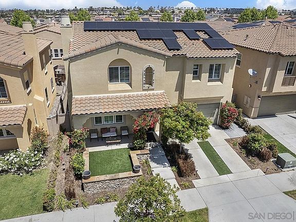 A truly exceptional 5-bedroom, 3-bathroom home in Chula Vista, California, offering 2,615sq. ft. of meticulously upgraded living space. This property boasts a prime location facing a serene park, ensuring no direct front neighbors.The exterior features a welcoming front porch with artificial turf and a sturdy retaining wall that separates a spacious front driveway for ample parking. Step inside to discover an open floor plan, where every detail has been thoughtfully enhanced: new flooring throughout the entire home, a gourmet kitchen with a cooktop, double oven, microwave, refrigerator, and a large kitchen island; elegant crown molding, stylish shutters throughout and the convenience of a downstairs bedroom and full bathroom. A large sliding door overlooking the backyard floods the space with natural light. The upper level offers a blend of comfort and functionality, with a built-in cabinet office space that includes the convenience of a wine fridge and microwave. The master bedroom is a luxurious sanctuary, with a large ceiling fan, expansive space, and a dedicated walk-in closet for her and a large closet for him, and an en-suite bathroom boasting a dual sink vanity for two, a large central tub for ultimate relaxation, and a private toilet room. Equipped with cutting-edge upgrades that enhance efficiency and convenience, include paid-off solar (Sempre Solaris system). A dedicated car charger and battery, and an efficient tankless water heater. This stunning residence is meticulously upgraded from top to bottom and offers an unparalleled living experience.