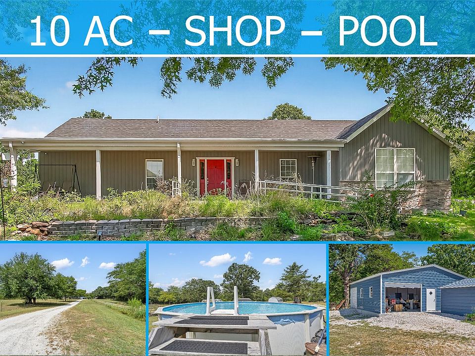A 2400sq' one level, 4 bedroom, 2 bath home in the center of 10 acres with a private drive. The acreage is a great mix of woods and pasture with lots of deer and turkey. Secure fencing for livestock, a seasonal creek and plenty of room to roam for recreation. There's a new 30x35 shop with 10' sidewalls, R-17 insulation and two overhead doors. Multiple other outbuildings to shelter animals or equipment. The home is in great shape with a new roof last year, new board and batten vinyl siding, soffits, crawlspace encapsulation, new tile primary shower and more. There's a wonderful front porch patio and a rear climate controlled sunroom, a connected 2 car carport and a 25' round pool. It's located just minutes from Bolivar and is a 20 minute commute to Springfield.