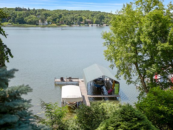 This Quintessential Nantucket style home sits on nearly 1 acre with 75' of sandy lake shore, west facing views and breathtaking sunsets overlooking forest lake bay. The home features 4 large bedrooms 4 baths with lake views from every room. The two large decks and four season porch are great for entertaining inside and out. Large master with private balcony, updated kitchen, wide plank restored hardwood floors and large lower level family room. The 1400 square foot guest house has a full kitchen, 2 bedrooms, 1 bath and a bonus room in lower level. Newer Tram system down to the lake.