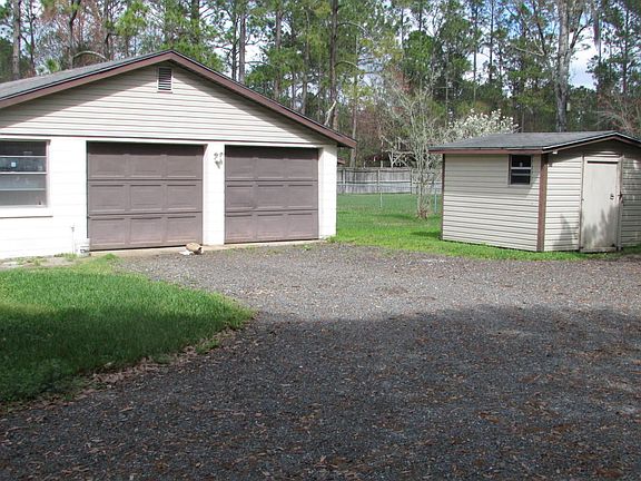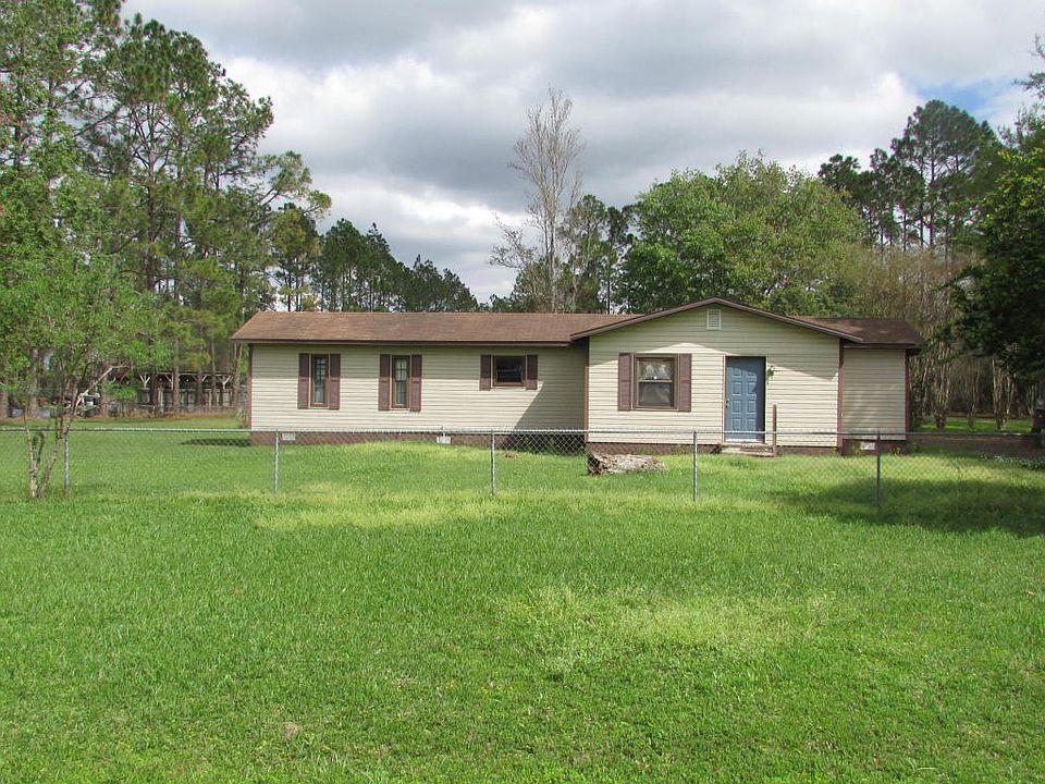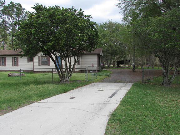 Beautiful Property! Close to 1 3/4 acres, with a pond, a detached block garage, nice asphalt millings circle driveway, Property is fenced. Mobile home with hardwood flooring, 2 bed, 2 bath, nice master vanity with granite, Cute kitchen open to the family room plus an additional large room as playroom, another bedroom, pool table, many possibilities. AC, approx. 3 years old. Enjoy sweet orange tree and pear tree, fish in the pond and ride your 4 wheelers, or just enjoy no HOA and being on your own property. Very close to the Bike trail! Large covered concrete slab was used as dog pen. Home was brought to engineering code at time of purchase. Sold as-is. Cash only due to age of mobile home. Little TLC.