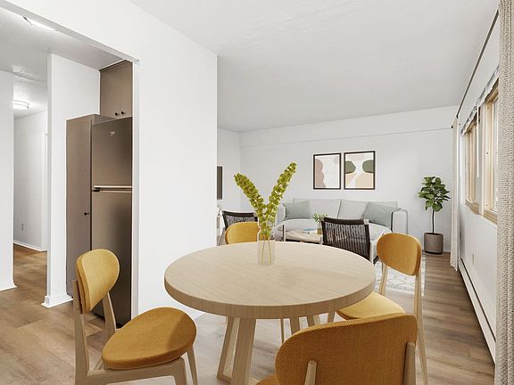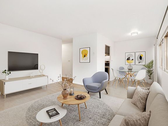 Apartments offer treelined views of an urban park; cityscapes; and a cozy midcentury design. Updated amenities include in-unit washer/dryers; quartz counters; a mod color scheme; stainless-steel appliances, and a dog run.