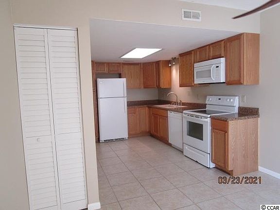 Golf cart to Ocean! Pristine 3 bedroom 2 full and 1 half bath just painted. Move in ready. Fenced yard for privacy. New Kitchen cabinets, lighting, dishwasher, garbage disposal 3 years old. Upstairs master bedroom has walk-in closet and private bath. Newer bathrooms cabinets and mirrors. Hall linen closet. Walk up attic space. Tile floors first floor. New mini blinds. All bedrooms have ceiling fans. Private gated yard. Enjoy the Ocean just minutes away by golf cart. Close to Broadway at the Beach, Family Kingdom, Fishing Pier, Tanger Mall, Coastal Mall, Restaurants, Fat Harold's Beach club dancing! So many things to do in our beautiful area!