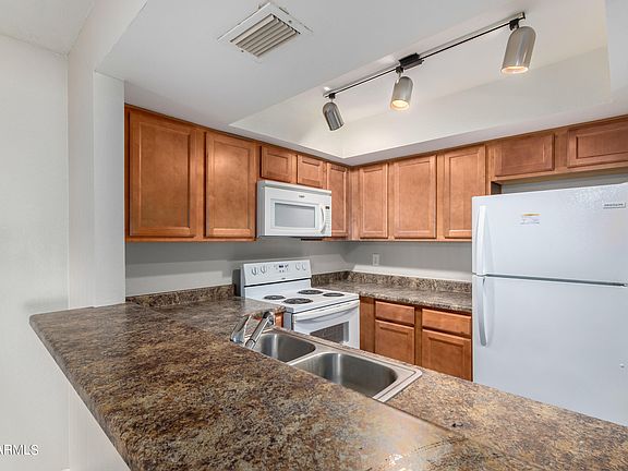Located in Mesa, this ground level 2 bedroom, 2 bathroom condo is perfect. Step inside and be greeted by a large living room with updated wood look flooring throughout that complements the fresh white paint. Bright and light kitchen includes matching white appliances, solid surface countertops, ample cabinetry, dual sinks, overlooking the living room and opens to the dining area for easy entertaining. The Roomy primary bedroom has a private bathroom and closet for your belongings. Close to dining, shopping, parks, hiking, and major freeways. All of this plus a beautiful pool and more