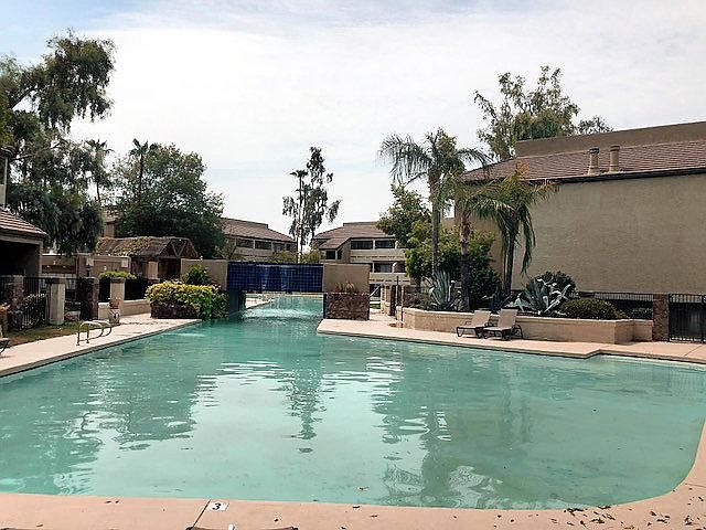 Beautiful condo with a large pool and waterfall, hot tub, bbq areas, and lots of room to entertain. No maintenance and owner pays water & HOA fees! Open layout with a fireplace, spacious updated kitchen, tile flooring, new paint and new carpet throughout being installed this week. 2 Master Suites with full baths and double closets, ceiling fans, and one with a covered balcony. Owner Pays Water & HOA Fees