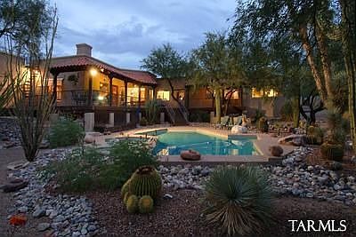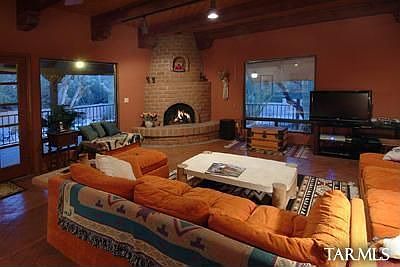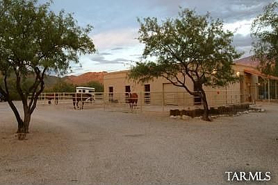 HACIENDA STYLE HOME and 5 STALL BLocK BReezeway BaRN W/RUNS, round pen and turnout, caretakers apartment with kitchen and full bathroom in barn, oversized garage and WORKSHOP in barn, house also has an attached 2 car garage, ON 4 ACS IN HORSEMENS PARADISE LA CEBADILLA WHERE WILDLIFE ABOUNDS. STOCKED LAKE-RIDE THE RINCONS/NAT'L FOREST. SPRAWLING TERRITORIAL W/HUGE GREAT ROOM-HIGH BEAMED CEILINGS, kitchen and bathrooms updated in 2012, bar, perfect for entertaining. Travertine TILE-BEEHIBE FPL-BIG RMS INCLUDING HUGE MSTR BEDRM W/GAS FPL-WALLS OF GLASS-DEEP COV PORCH/DECK OVERLOOKS POOL and hot tub, outdoor kitchen, built-in gas grill, fire pit, MATURE TREES + 11 SAGUAROS FRAMING AWESOME CATALINA and RINCON MTN VIEWS. RV space with full hookup, including 30amp service and dump station.