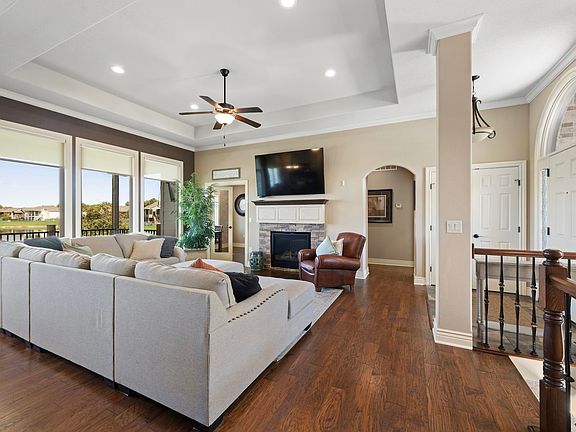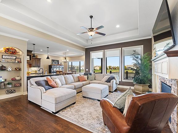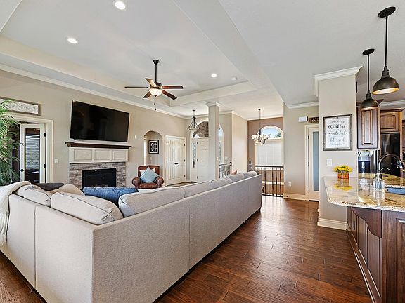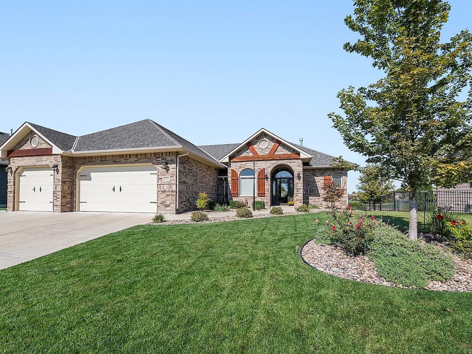 Nestled in the Liberty Park Addition, with No Special Taxes and within the Maize School District, this stunning custom-built 4-bedroom, 3-bath ranch offers unparalleled lake views and exceptional upgrades. The all-brick front exterior and professional landscaping create an inviting curb appeal, while the 1-step entry and transom windows add elegance. Inside, the open-concept living area features floor-to-ceiling windows, filling the space with natural light and breathtaking lake views. The living room boasts a coffered ceiling, a cozy gas fireplace, and hardwood floors, which extend into the dining room and second bedroom, accessed by French doors. The chef’s kitchen is a dream, with granite countertops, a tile backsplash, an induction cooktop, a custom range hood, soft-close cabinets, and a large pantry. All stainless-steel appliances are included. The main floor also offers a mudroom/laundry room with a large sink, countertops, a closet, and a bench for convenience and a convenient half bath. The private primary suite features more serene lake views and coffered ceilings. It’s spa-like bath includes a large walk-in closet, double vanities with granite countertops, a soaker tub, a stand-alone custom shower, and a separate water closet. The expansive view-out basement is perfect for entertaining or relaxation, complete with a wet bar/kitchenette, space for a full-size refrigerator, and a fun entrance to the theater room, which comes fully equipped with a 110" screen, 4K projector, recliners, and a sound system. There is an additional finished room, perfect for workouts crafts or whatever your needs may be. The basement also includes two more spacious bedrooms, a full bath, a concrete safe room, and abundant storage. Additional highlights include an oversized 3-car garage with an epoxy floor, mini-split HVAC, an 18' workbench, and a second stairwell to the basement. Enjoy the outdoors on the covered deck with a mounted TV, a new patio, a sprinkler system, and an irrigation well. A bonus is there are NO special taxes!! Owned water softener and Reverse Osmosis system. Just a short drive to the Northwest YMCA, New Market Square Shopping District, churches, numerous restaurants! This home is truly a gem in Northwest Wichita! Don’t miss your chance to make it yours today! Call for your own special showing!!