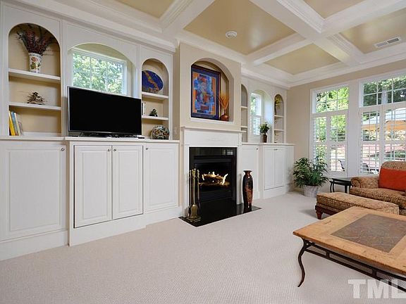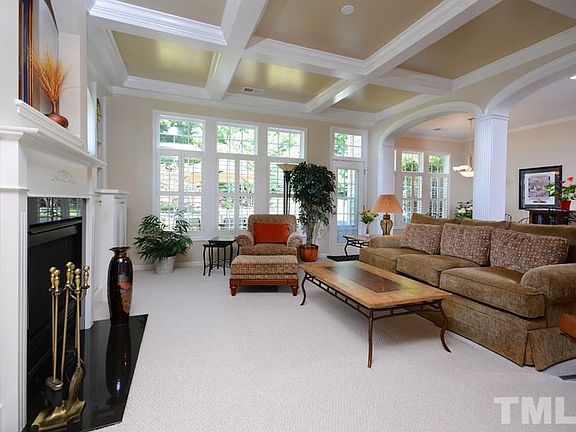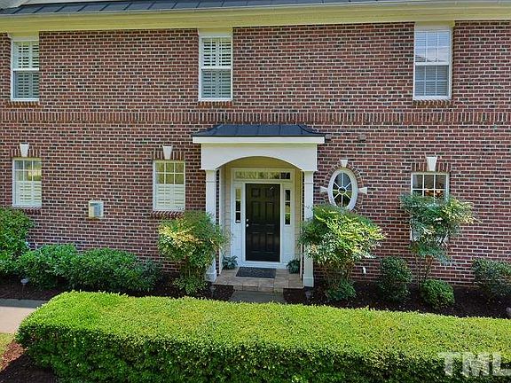 Stunning end-unit town home, gated community w/ private front entrance. Well maintained. Large tiled patio & backyard landscaping. Open floor plan, 11 ft. ceiling on 1st floor. Spacious kitchen w/ built-in bar, granite. Formal dinning & breakfast area. Custom cabinetry in living room. Large master w/sitting area, spacious bath. Coffered ceiling in living room & master bedroom. Large 2 car garage, walk up attic. Plantation shutters 1st floor & master. New AC unit, water heater, gas range. Near RTP, RDU.
