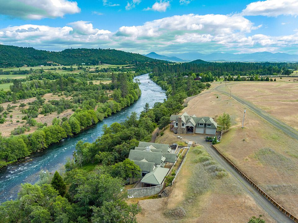 Stunning Rogue River front property with breathtaking views, 240 acres of EFU and OSR zoned land, 4 tax lots, and 1/4 mile of river frontage. The house was built by a seasoned European developer with a love for quality stone masonry and impeccable attention to detail: curved archways, generous windows, vaulted ceilings, maple and cherry floors, granite counters, abundant cherry cabinetry, limestone floors and a central stone fireplace made from imported Eastern European stone. The light-filled property offers a total of 5 bedrooms with river views, 2 home offices, 5 full and 2 half baths, as well as balconies. A driveway leads directly to the Rogue River with unobstructed access. This rare one-of-a-kind riverside sanctuary offers total privacy and immersion in nature. Tours are invited upon request.