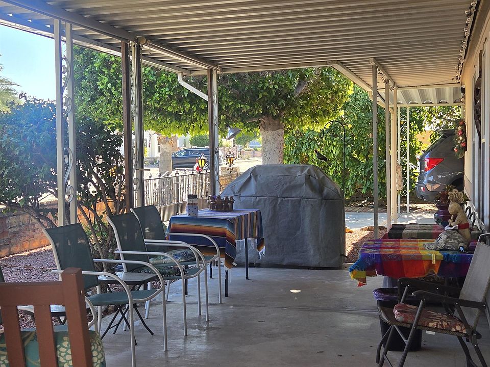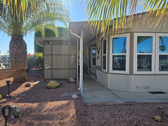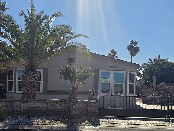 Welcome to this well-maintained manufactured home in the heart of Foothills Mobile Estates 12, offering comfort, space, and the kind of outdoor living the Yuma Foothills is known for. This 2-bedroom, 2-bath home features 1,614 sq. ft. of living area, an updated interior, and multiple outdoor spaces designed for easy desert living. Situated on a 6,768 sq. ft. lot, this property provides RV potential, storage, and room to grow. Step inside to an inviting floor plan with vaulted ceilings, and plenty of natural light. The kitchen includes an electric stove, built-in storage, and convenient dining space. The primary suite features his-and-her walk-in closets, a ¾ bath, and upgraded shower dressing area. Recent updates include appliances (new washer/dryer last year), and a 2020 water heater, ensuring energy-efficient functionality. The outdoor areas are where this property truly shines. Enjoy a spacious covered patio, screened-in patio with 4 wind panels, plus a lemon and lime tree for seasonal fruit. The side yard with double gate provides a 29' access point—ideal for RV, trailers, or additional parking. A storage shed with a watering system adds functionality. The yard features low-maintenance desert landscaping, refreshed at the start of each season. Additional features include: Palm Harbor home construction 28x60 model, built in 1992 Multiple storage areas, including a bar with sink Fruit trees Concrete and paver improvements throughout outdoor spaces Water softener, RO system, and updated utilities Carport + additional parking area Whether you’re looking for a seasonal escape, investment opportunity, or full-time Yuma home, this property offers a great combination of space, storage, upgrades, and classic Foothills living.