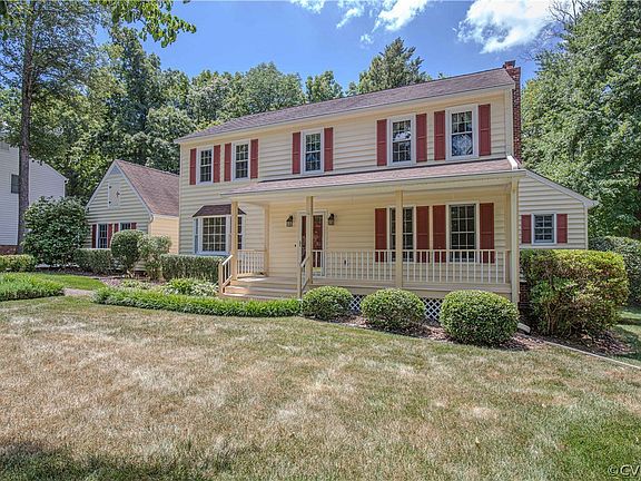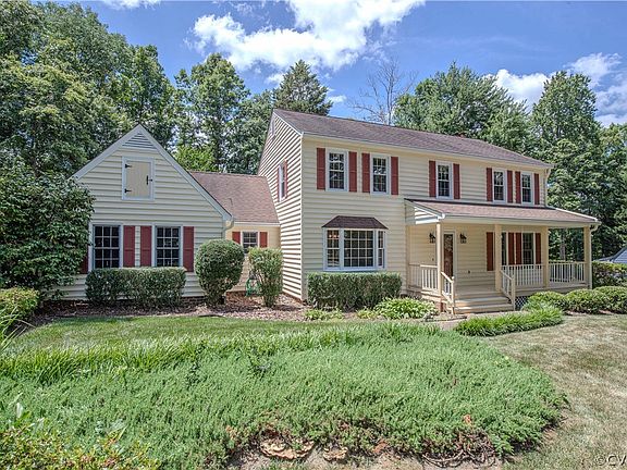 Get the moving van ready! You don't want to miss this opportunity in the popular and sought after QueensMill neighborhood! This 4 bedroom 2 1/2 bathroom home has completed big ticket items including vinyl siding, some vinyl windows and kitchen with newer cabinets, quartz counter tops and island! This home is move in ready and just waiting for the new owners to put their personal cosmetic touches to work to make it their own! The first level with back of house living areas that include the family room with chair rail, crown molding, wainscoting, brick gas fireplace and gas logs opens through French doors to the generous 33' by 12' rear deck that overlooks the semi-private maturely landscaped back yard and provides a mud entry to the 1st level half bathroom hall. The updated kitchen is open to the family room and includes a breakfast nook, pantry, wine bar, stainless appliances, quartz countertops and tile back splash. The dining room with large bay window and over sized living room include well maintained wood flooring and are trimmed out with crown molding! Primary bedroom with 2 walk-in closets, full primary bathroom with newer tile shower! The second level is completed with 3 additional bedrooms and a full hall bathroom with cast iron tub shower! First level laundry with cabinets is convenient to the garage and mud entry hall! One car attached rear entry garage with pedestrian door! The attached shed for extra storage houses the property mechanical systems! Spend relaxing days on the wide full front country porch that overlooks this level, park-like lot that has been professionally maintained and is a very short walk to the neighborhood playground and pool with optional membership. Community swim team, Friday hotdogs nights, neighborhood events through the year! There are neighborhood connector trails close by for walking and biking into the historic Midlothian areas! Anyone who knows Midlothian understands the convenience of this location for commutes, shopping, dining, work out facilities and more!