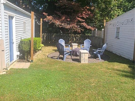 BEAUTIFUL West Toledo 3 bed 2 full bath! Features LR, formal DR, updated kitchen, full bath with updated Bathfitter surround and 2 main floor bdrms. One bdrm has newer sliding door leading to large backyard with gravel firepit area complete with custom stone tables! Upstairs dormer boasts large primary suite with full bath! Home also has refinished hrdwd floors, newer windows, vinyl siding, electrical and white 6 panel interior doors. Bsmt with movie screen/projector. Garage with newer opener (you can control from your phone!). *firepit ring, chairs, string lights/posts don't stay**